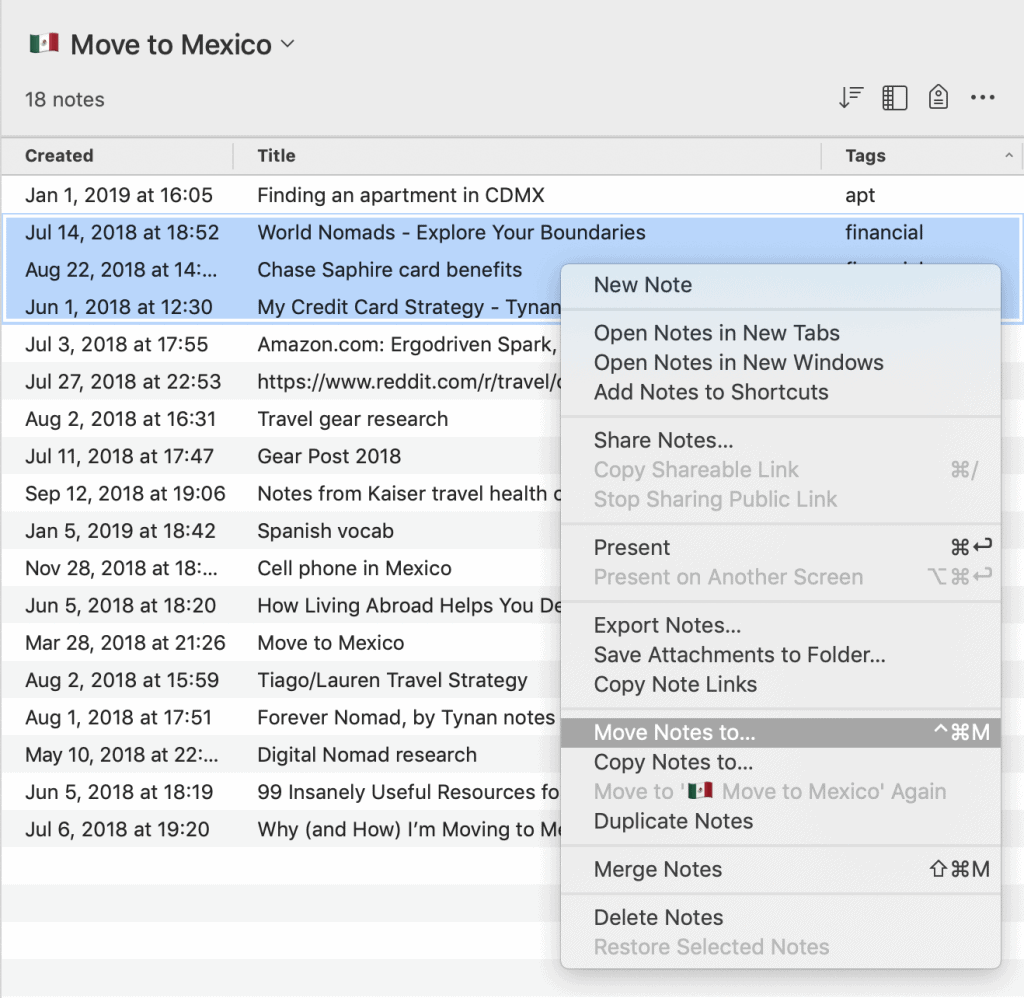 After a few months of research, I may have gathered several dozen notes, and the notebook might be starting to get too cluttered to find what I’m looking for. At this point I can easily “segment” the notebook by tagging notes according to broad types like [apartment], [language], [logistics], [financial], [gear], [research], [writing], etc. I suggest using a small number of types so you can see your options at a glance just by looking at the Tags column.