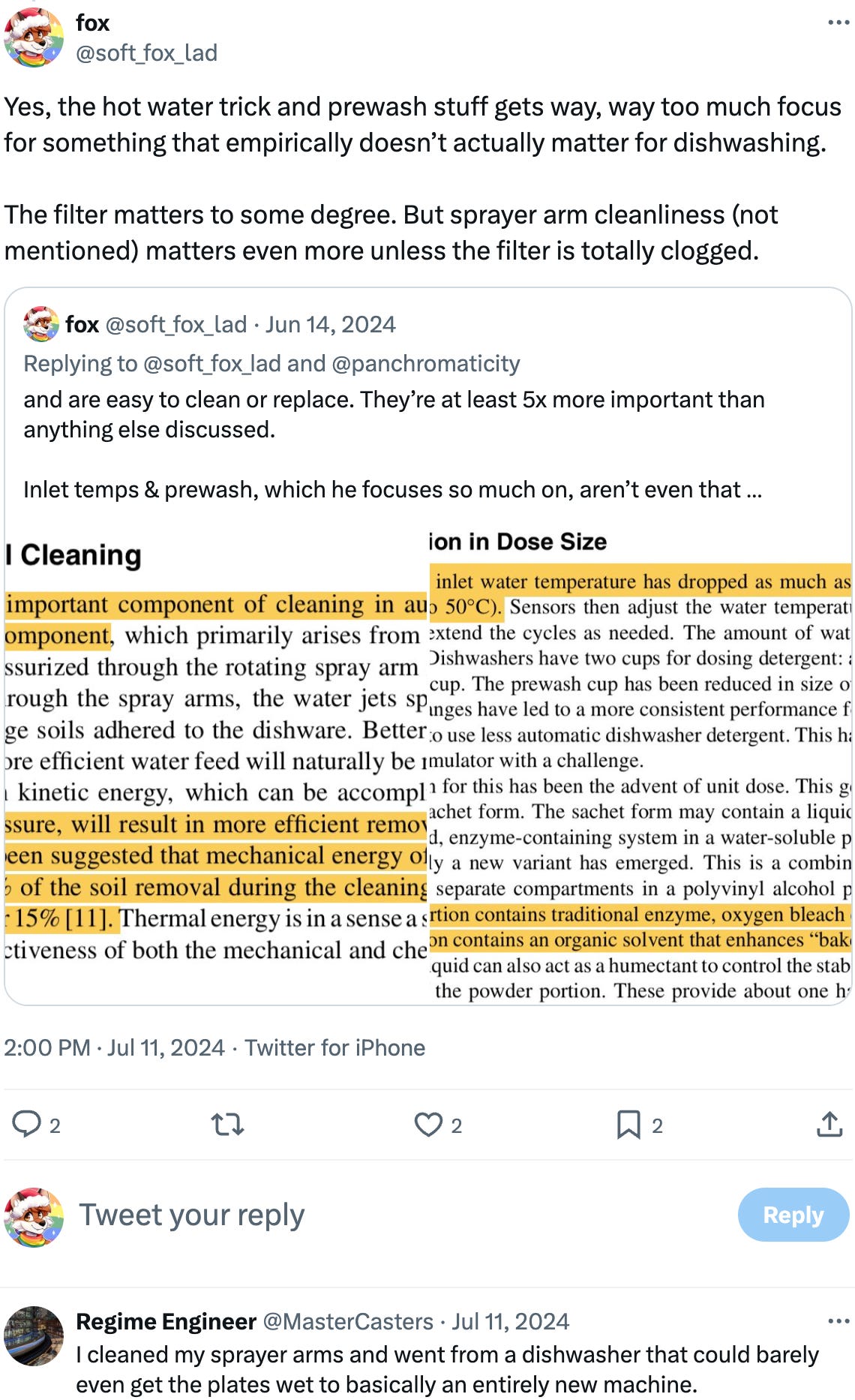 In his video about how to make dishwashers clean better, he focuses a lot on things that don’t matter, like inlet temperature. But if your filter is even a little bit clean, you only need to be concerned about three things: is your detergent any good, are you loading the dishwasher correctly, and—something he completely omits—are the sprayer arms clear? The latter really matters. Don’t just take my word for it. Others agree: