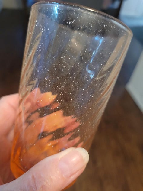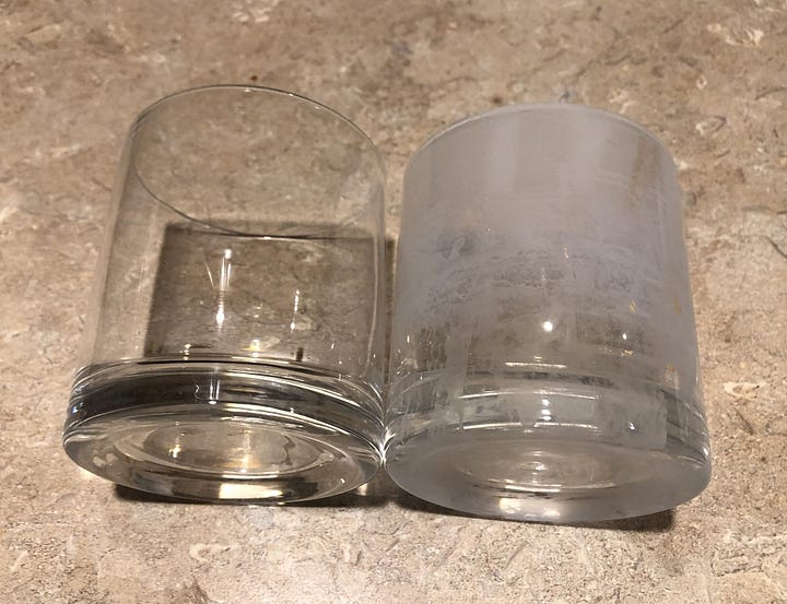 If you’re fine paying extra money, consider adding Finish Jet Dry Dishwasher Rinse Aid Hardwater Protection (yes, it should be that specific version of Jet Dry) at the maximum dosing level* supported by your dishwasher. (Nitpick: Alec’s claim that rinse aids are all similar is also wrong.) This specific Jet Dry will help in three ways. In order of importance: first, and most importantly, it helps by making water “sheet off,” so that very little of the lime-rich water remains on your glasses. It directly addresses the issue of tons of water pooling on the rims of your glasses and creating those super thick limescale films seen earlier, though some water (patent: potentially <1%) will still remain. That’s where the second-most important feature comes in: a state-of-the-art calcium dispersant and antiredeposition polymer. I believe it’s either Alcoguard 4160 or, based on this patent, one of three other things. Out of respect for those whose employers prohibit them from reading patent details, I’ll omit the specific ingredient names, though you can find them in the above patents by ctrl-f-ing for “may be substituted.”