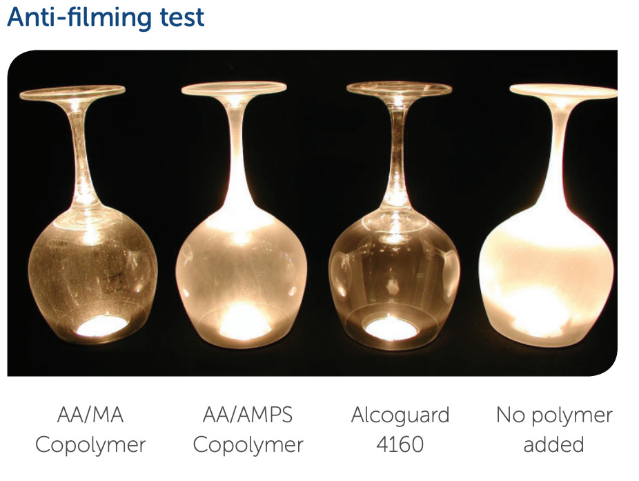 These polymers are the real deal: they disperse the precipitates, preventing them from crystallizing on glass. They also inhibit new precipitates, though by the rinse cycle, it may be too late. The third most important feature is the inclusion of a great sequestrant, EDTA, though I doubt it does much at the concentrations and timescales at play in a dishwasher.