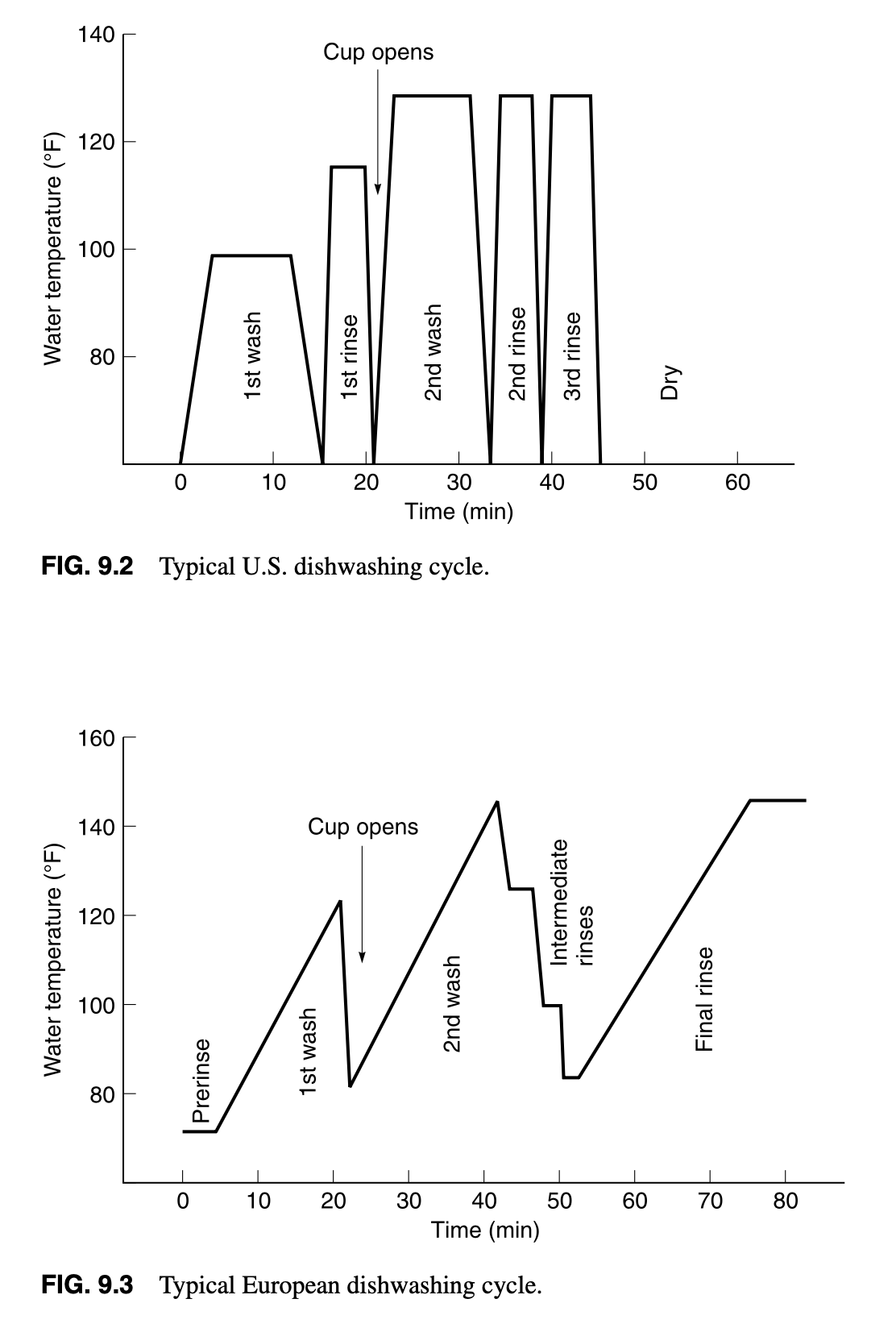 These sorts of un-American machine behaviors are common with European dishwashers. See, also from “Liquid Detergents,” this comparison. Note that pre-2013-efficiency-standards dishwashers in the United States wash more like the first picture than today’s American machines, and that all machines (US or otherwise) are more Bosch-like, especially Frigidaire’s and Whirlpool’s.