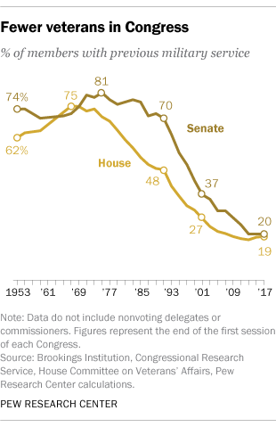 And indeed at the height of representation of Vietnam veterans in Congress a combined 21 in the House and Senate served at once. In fact members of congress born during the years that made one draft-eligible for the Vietnam war were three times more likely not to have served in the armed forces at all than to have served, let alone to have served in combat. If the country was so transfixed by the white grievance politics of Vietnam veterans, why were more not elected to our legislature? Nor can we say that they enjoyed the power of many votes, as veteran status in the population writ large continued to plummet after a mild and brief rise to coincide with the war: