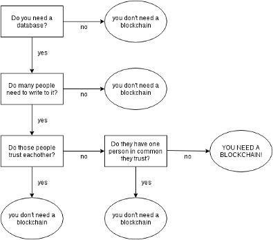 Is this censorship resistance something most businesses or consumers need, most of the time? Not really. Do you need censorship resistance when buying groceries from the farmer’s market? Not typically. Do you need censorship resistance when trading playable assets in your favorite video game or the metaverse? No. Do you need censorship resistance when doing inventory and supply chain tracking? Not usually. Do you need censorship resistance when donating funds to the Ukrainian army? …ah yeah you might for that, depending on the jurisdiction in which you live. So don’t get me wrong, there’s an important role for bitcoin and friends. But so many times in meetings with potential customers I had to wonder “why don’t you just use PostgreSQL? Or Riak? Does this really need a blockchain?” There are flowcharts like the one above to answer the question “Do I need a blockchain?” And unless you have very specific requirements, then the answer is always “No: use a database instead.”