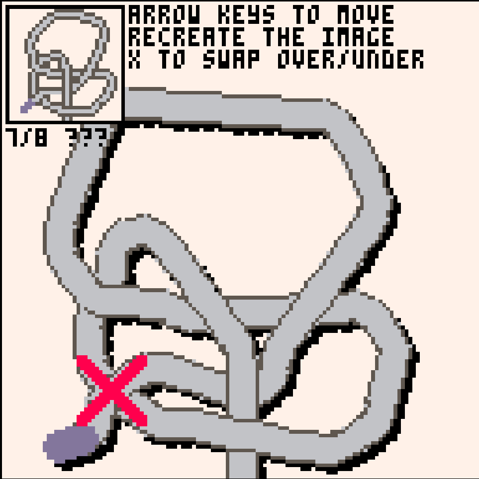 Same complaint as the others except its 8 and I tried again a few times and it's still not working. I assume that it's a bug. Anyways nice game :3 As a mathematician I feel like the collision detection should have implemented something closer to knot theory, but I am wrong because there are many knots that are the same according to knot theory and they all have to be closed loops. Essentially an "equivalent knot" is much broader and probably wouldn't be good for a game like this or learning to tie knots either. Good job on all of it. Pico 8 is nice to see too.