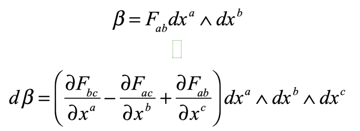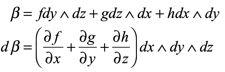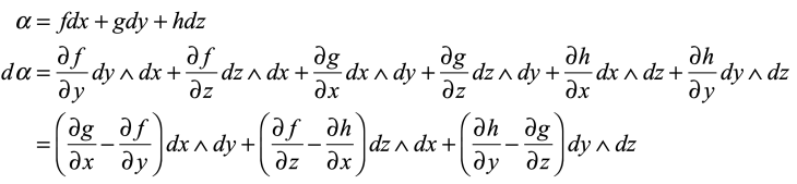 where the exterior derivative turns a differential r-form into a differential (r+1)-form. For instance, in 3D