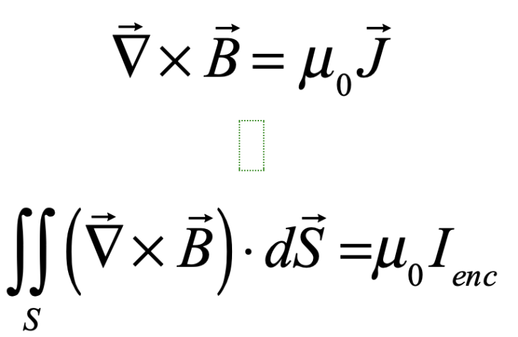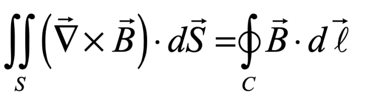 Maybe the most famous application of these theorems is to convert Maxwell’s equations of electromagnetism from their differential form to their integral form. For instance, we can start with the differential version for the curl of the B-field and integrate over a surface