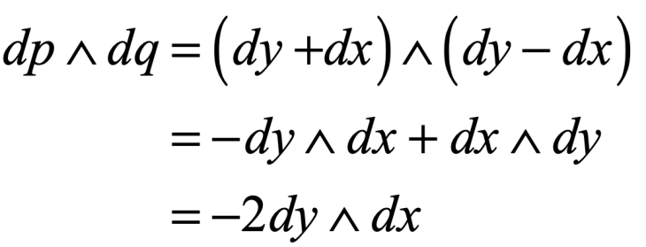Line integrals, as in the Fundamental Theorem of Calculus, are obvious and unique. However, as soon as we move to integrals over areas, the wedge product is needed. This is because a general area is oriented. If you think of a plane defined by z = 0, the surface element dxdy can be oriented along either the positive z-axis or the negative z-axis. Which one should you take? The answer is: don’t make the choice. Work with differential forms, and the integral may be over dx^dy or dy^dx, depending on the exterior analysis that produced the integral in the first place. One is the negative of the other. You take the element as it arises from the algebra, and you cannot go wrong!
