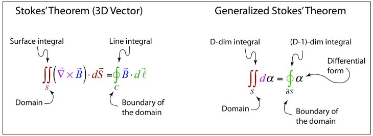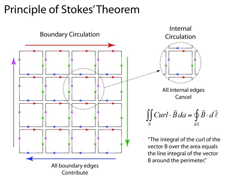 where the “hat” symbol is Grassmann’s wedge product (see below). In the case of Green’s theorem in 2D, the principle is easy to explain by the oriented vector character of the integrals and the notion of dividing a domain into small elements with oriented edges. In the case of nonzero circulation, all internal edges of smaller regions cancel pairwise until the outer boundary is reached, where a macroscopic circulation persists along all the outer edges. Similarly in Gauss’ theorem in 3D, the flux of a vector through the face of one element is equal and opposite to the flux through the adjacent element, canceling out pairwise until the outer boundary is reached and the net flux is finite summed over the outer elements. This general property of pairwise cancelation on adjacent subdomains until the outer boundary is reached is the general property of Stokes’ theorem that can be extended to space of any dimensions or onto general manifolds that do not need to be Euclidean.