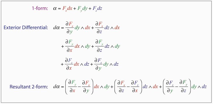 The power of differential forms is their ability to generalize automatically to higher dimensions. The differential 1-form can have any number of indices for multiple dimensions, and exterior differentiation yields the familiar curl theorem in any number of dimensions