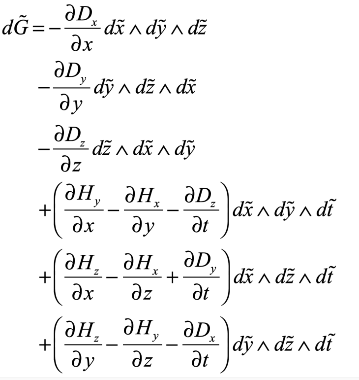As long as we are working with differential forms and Stokes’ Theorem, let’s finish up by looking at Maxwell’s electromagnetic equations as four-dimensional equations in spacetime. First, construct the 2-form using the displacement field D and the magnetic intensity H.