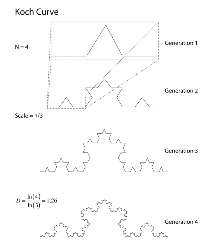The Koch curve begins in generation 1 with N0 = 4 elements. These are shrunk by a factor of b = 1/3 to become the four elements of the next generation, and so on. The number of elements varies with the observation scale according to the equation