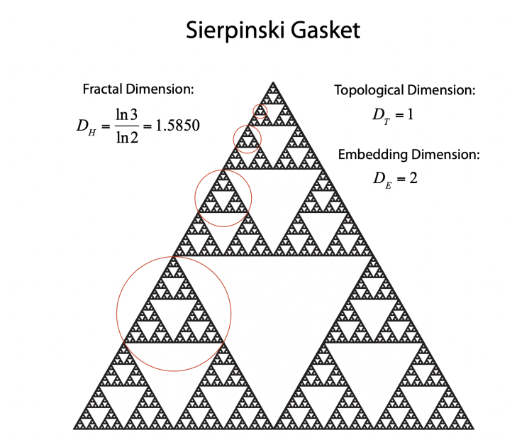Sierpinski considered how to define a curve that was embedded in DE = 2 but that was NOT constructed as a topological dimension DT = 1 curve as the curves of Peano, Hilbert, Koch (and even his own) had been. To demonstrate this point, he described a construction that began with a topological dimension DT = 2 object, a planar triangle, from which the open set of its central inverted triangle is removed, leaving its boundary points. The process is continued iteratively to all scales [9]. The resulting point set is shown in Fig. 5 and is called the Sierpinski gasket. What is left after all the internal triangles are removed is a point set that can be made discontinuous by cutting it at a finite set of points. This is shown in Fig. 5 by the red circles. Each circle, no matter the size, cuts the set at three points, making the resulting set discontinuous. Ten years later, Karl Menger would show that this property of discontinuous cuts determined the topological dimension of the Sierpinski gasket to be DT = 1. The embedding dimension is of course DE = 2, and the fractal dimension of the Sierpinski gasket is