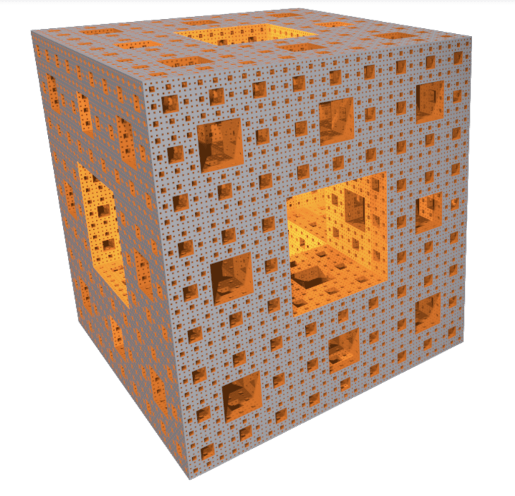 Fig. 6 Menger Sponge. Embedding dimension DE = 3. Fractal dimension DH = ln(20)/ln(3) = 2.7268. Topological dimension DT = 1: all one-dimensional metric spaces can be contained within the Menger sponge point set. Each face is a Sierpinski carpet with fractal dimension DH = ln(8)/ln(3) = 1.8928.