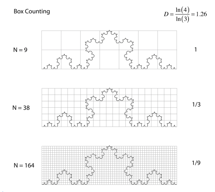 To be numerically accurate, this method must be iterated over several orders of magnitude. The number of boxes covering a fractal has this characteristic power law dependence, as shown in Fig. 8, and the fractal dimension is obtained as the slope.