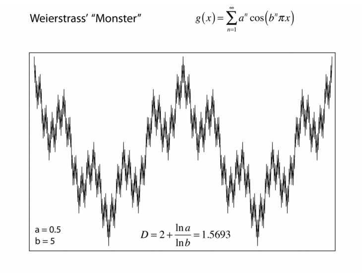 where b is a large odd integer and a is positive and less than one. Weierstrass showed that the left and right derivatives failed to converge to the same value, no matter where he took his point. In short, he had discovered a function that was continuous everywhere, but had a derivative nowhere [2]. This pathological function, called a “Monster” by Charles Hermite, is now called the Weierstrass function.