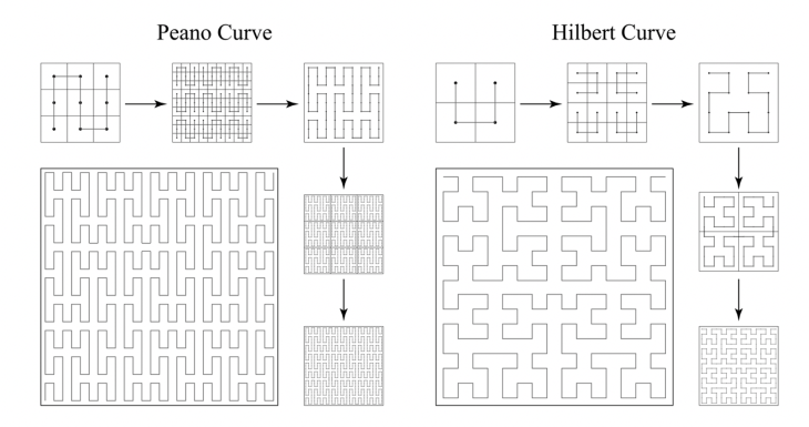 Fig. 3 Peano’s (1890) and Hilbert’s (1891) plane-filling curves. When the iterations are taken to infinity, the curves approach every point of two-dimensional space arbitrarily closely, giving them a dimension DH = DE = 2, although their topological dimensions are DT = 1.
