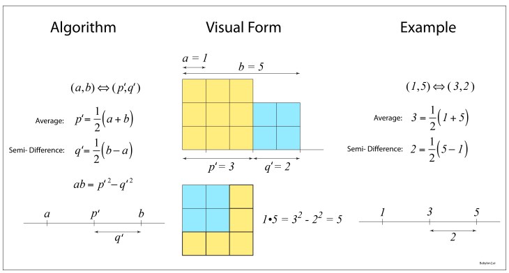 The algorithm begins by associating to any pair of number (a, b) a unique second pair (p’, q’) where p’ = (a+b)/2 is the semi-sum (known as the average), and q’ = (b-a)/2 is the semi-difference. The Babylonian mathematicians discovered that the product of the first pair is given by the difference in the squares of the second pair