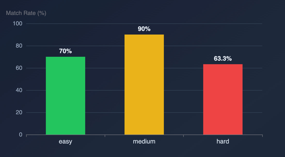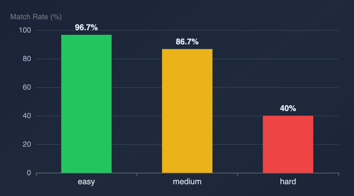 When the function still wasn’t matched in the Programmatic Phase, nearly half of the matches happened on the first attempt of the AI-Powered Phase. If a function isn’t matched by the 3rd attempt, the conditional probability of eventually matching drops to roughly one-quarter.