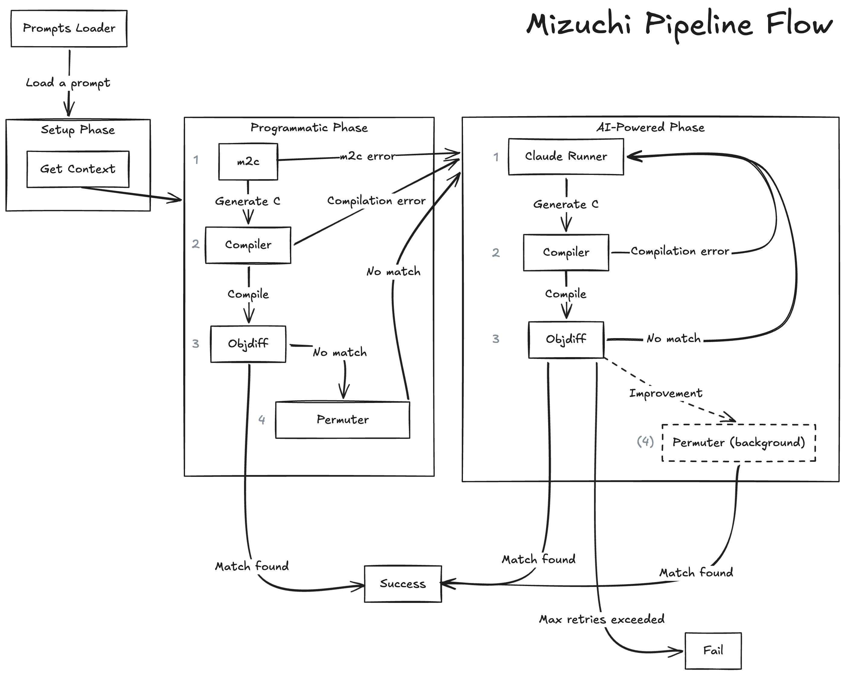 m2c produces a first attempt to decompile a function, then calls Compiler and Objdiff. It may then call Permuter, which iterates through code permutations. If there is no perfect match, it goes to the AI-Powered Phase.AI-Powered Phase: It's a loop including Claude Runner → Compiler → Objdiff.
