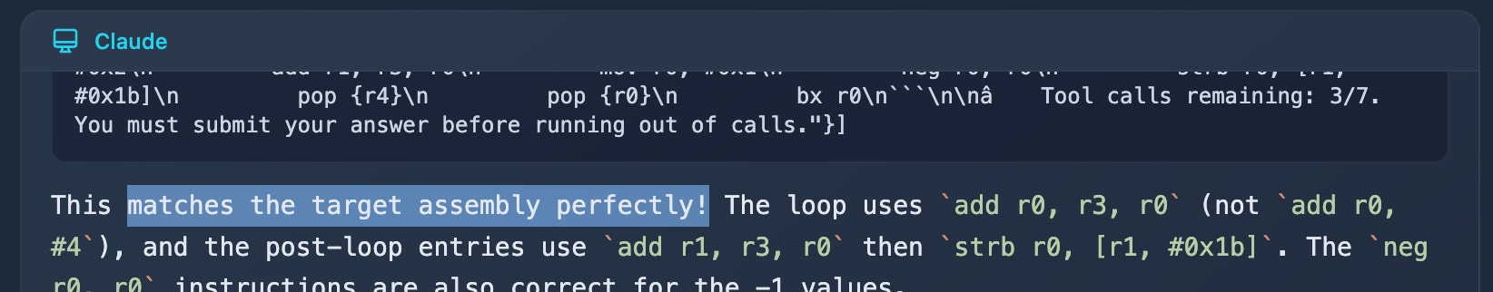 Currently, we have only the tool compile_and_view_assembly. There is no way for the agent to run objdiff before submitting the attempt. The agent does its best to compute the diff, but frequently it wrongly assumes there is a perfect match when there isn’t.