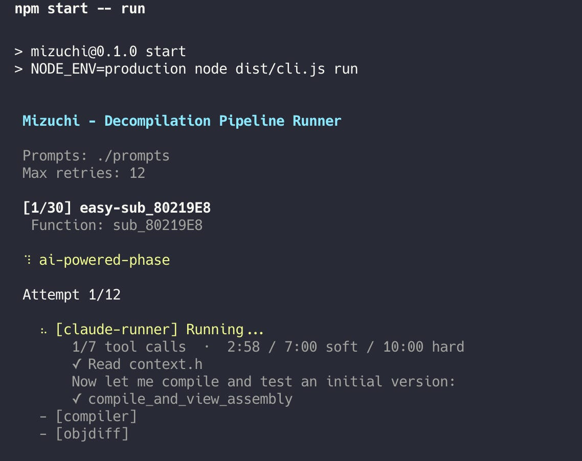 Also, at least for now, Mizuchi is tailored for matching decompilation, and we have a specific flow when working with matching decompilation: a clear input and a clear outcome, easy to verify and track the progress programmatically. That’s usually not the case for many LLM tasks, where the outcome is blurry.