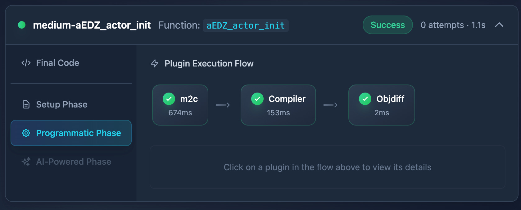 This phase runs Permuter as a background task. Whenever Claude finds a better match, it spawns a background job with Permuter to iterate the code produced by Claude. We use the result from Permuter only if it finds a perfect match, and in this case, the pipeline is finished.