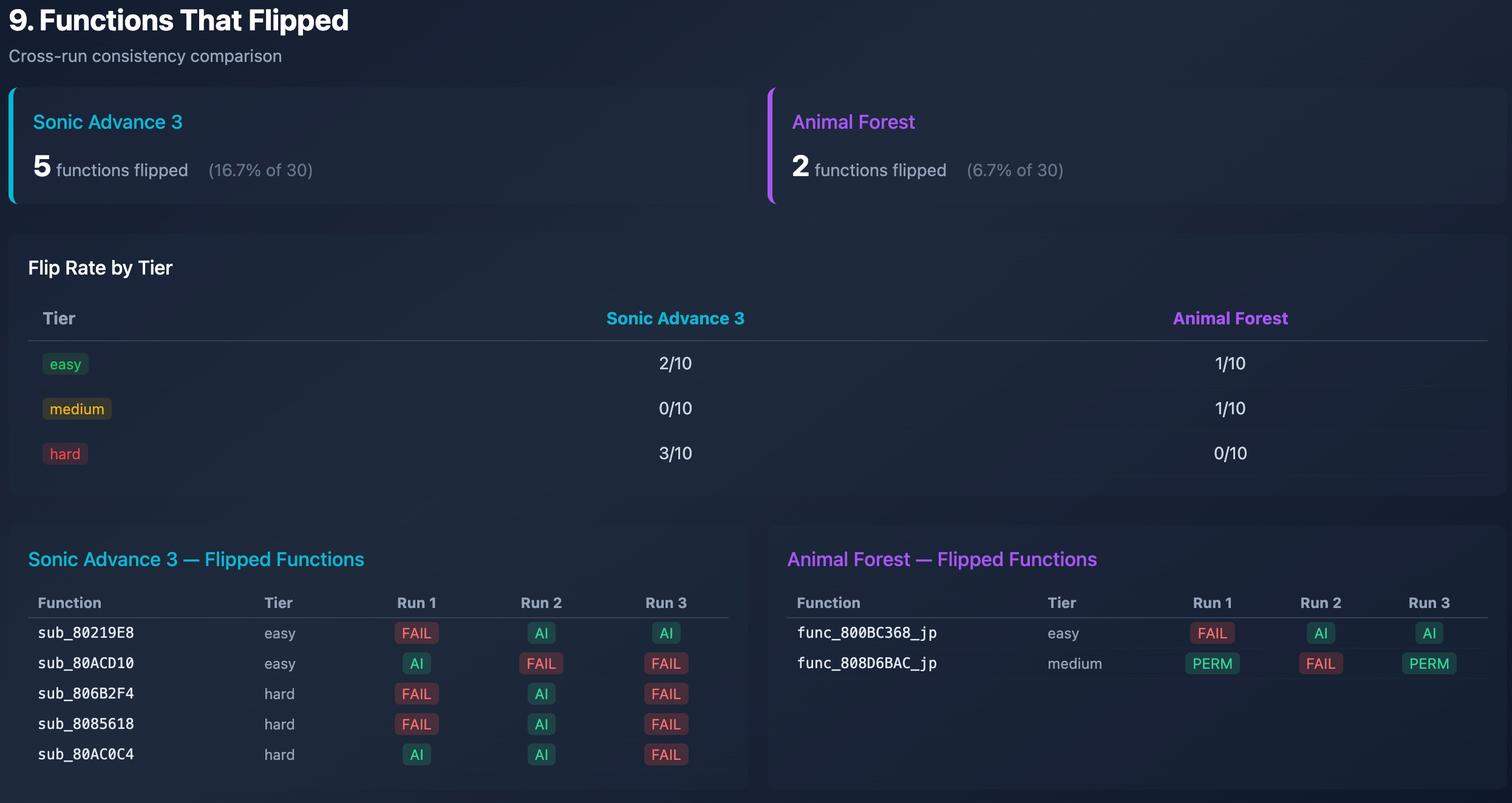 In most cases, the result per function is stable per run. A function that matches in one run will typically match in the others, and vice versa. Still, there are curious cases where flips happen. There were 5 functions that flipped on SA3 and only 2 functions that flipped on AF.