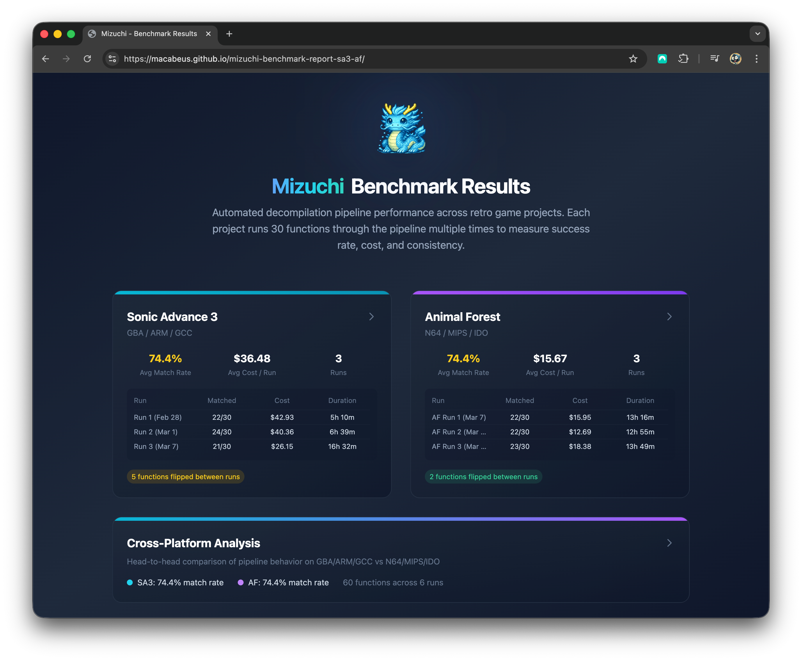 I also reduced the scope for Mizuchi here. For SA3, I filtered to only Thumb functions, since m2c and agbcc (the GBA compiler) only work well for Thumb instructions. And for AF, I filtered to only the functions for which I could programmatically generate a valid context file using m2ctx.py.