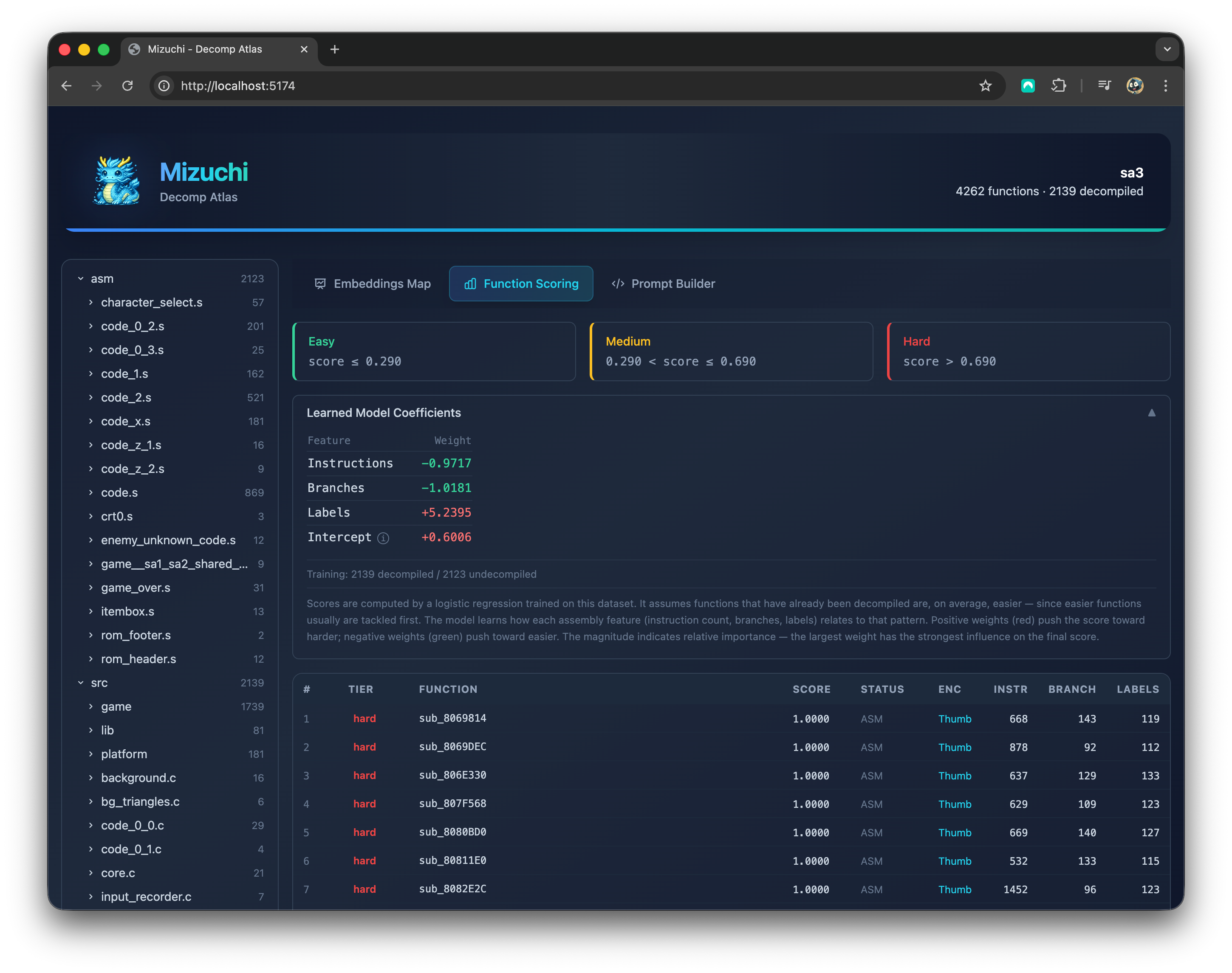 I started with the idea written by Lewis here and his code here. The scores are computed by a logistic regression trained on the project's codebase using a set of assembly features. It assumes functions that have already been decompiled are, on average, easier.