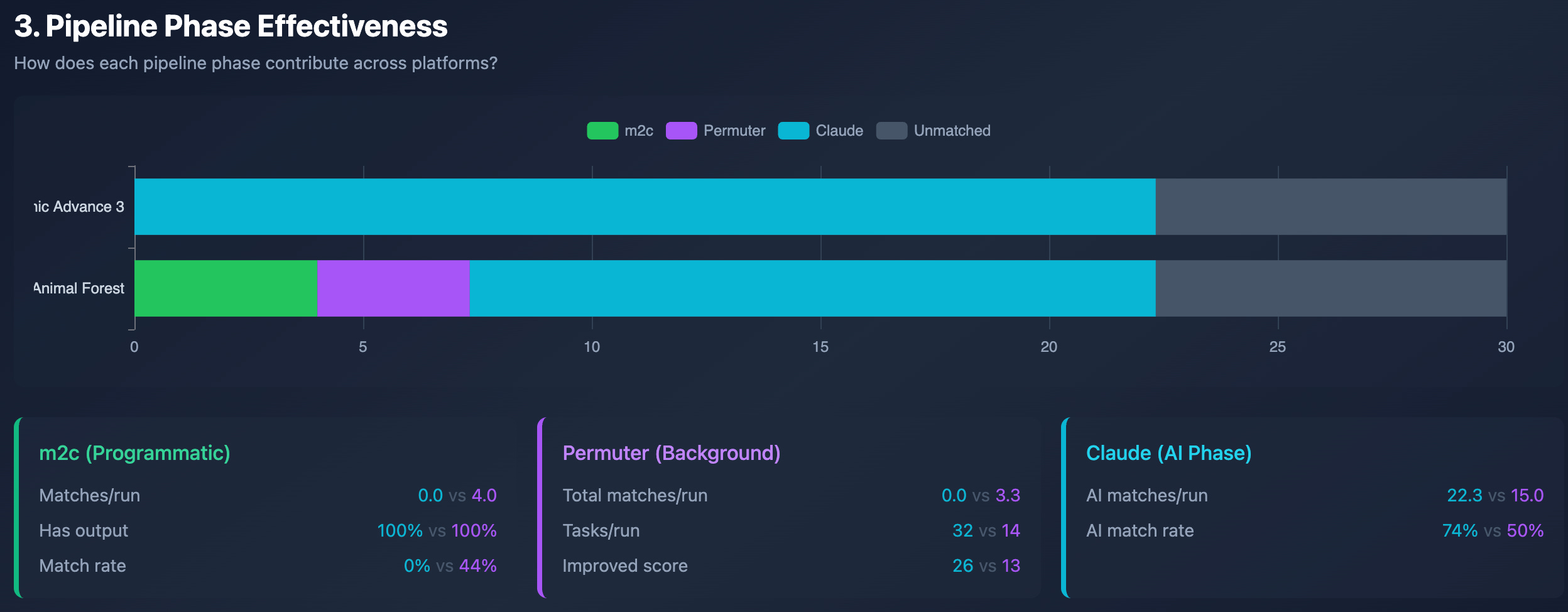 Permuter mostly found matches using the code generated by Claude. The only exception is func_808D6BAC_jp, where it found the match still in the Programmatic Phase, using the m2c code as the base. Curiously, in Run 1 and Run 3, Permuter helped to match the function func_808D6BAC_jp while in Run 2, no match was achieved for this function.