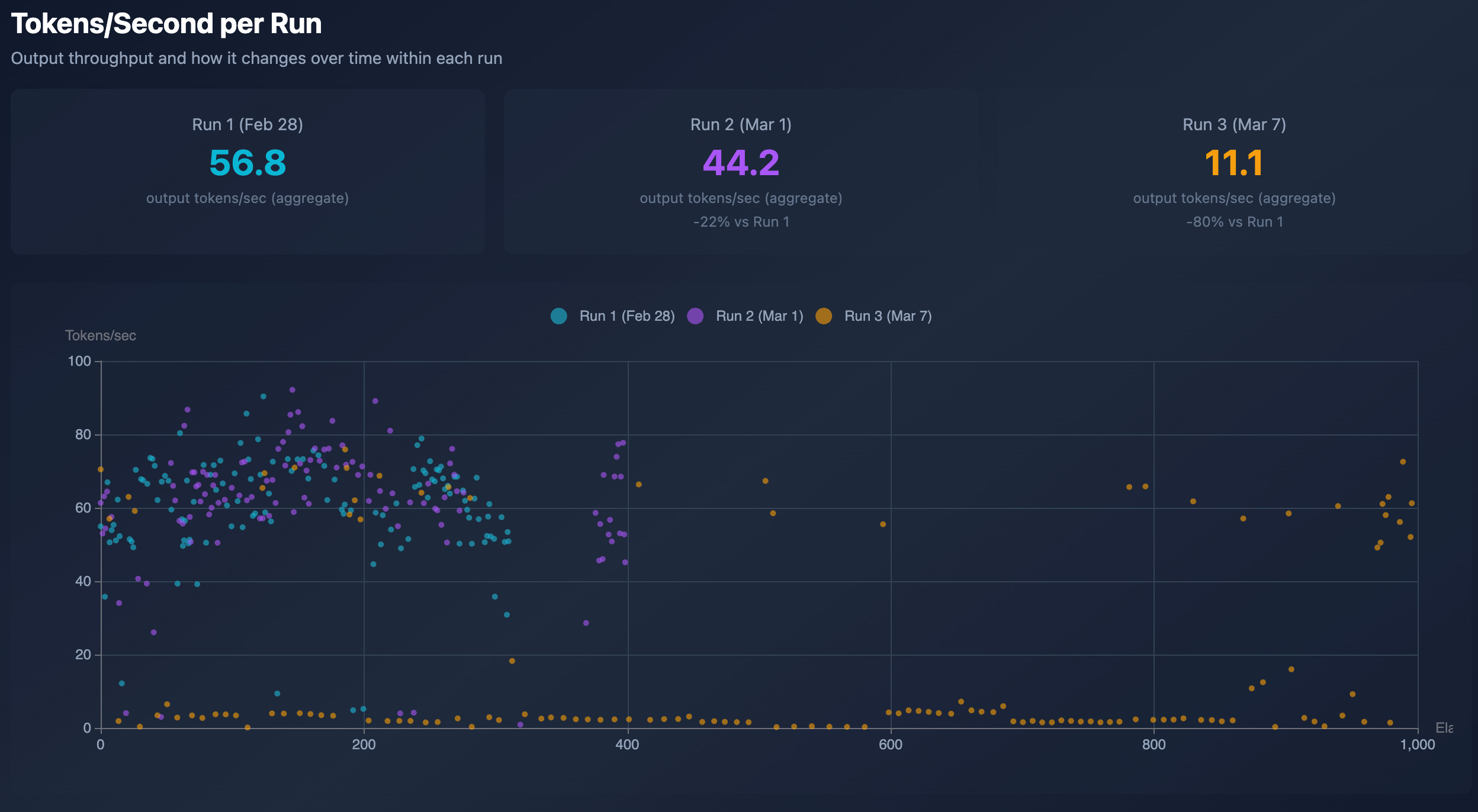 The first two runs had a much lower average attempt count and fewer timeouts. It happened because of an API latency degradation: throughput dropped from 57 tokens/second to 11 tokens/second (5x), causing 95 soft timeouts that cascaded into 59 compile failures, since code produced under soft-timeout pressure usually has compilation errors.