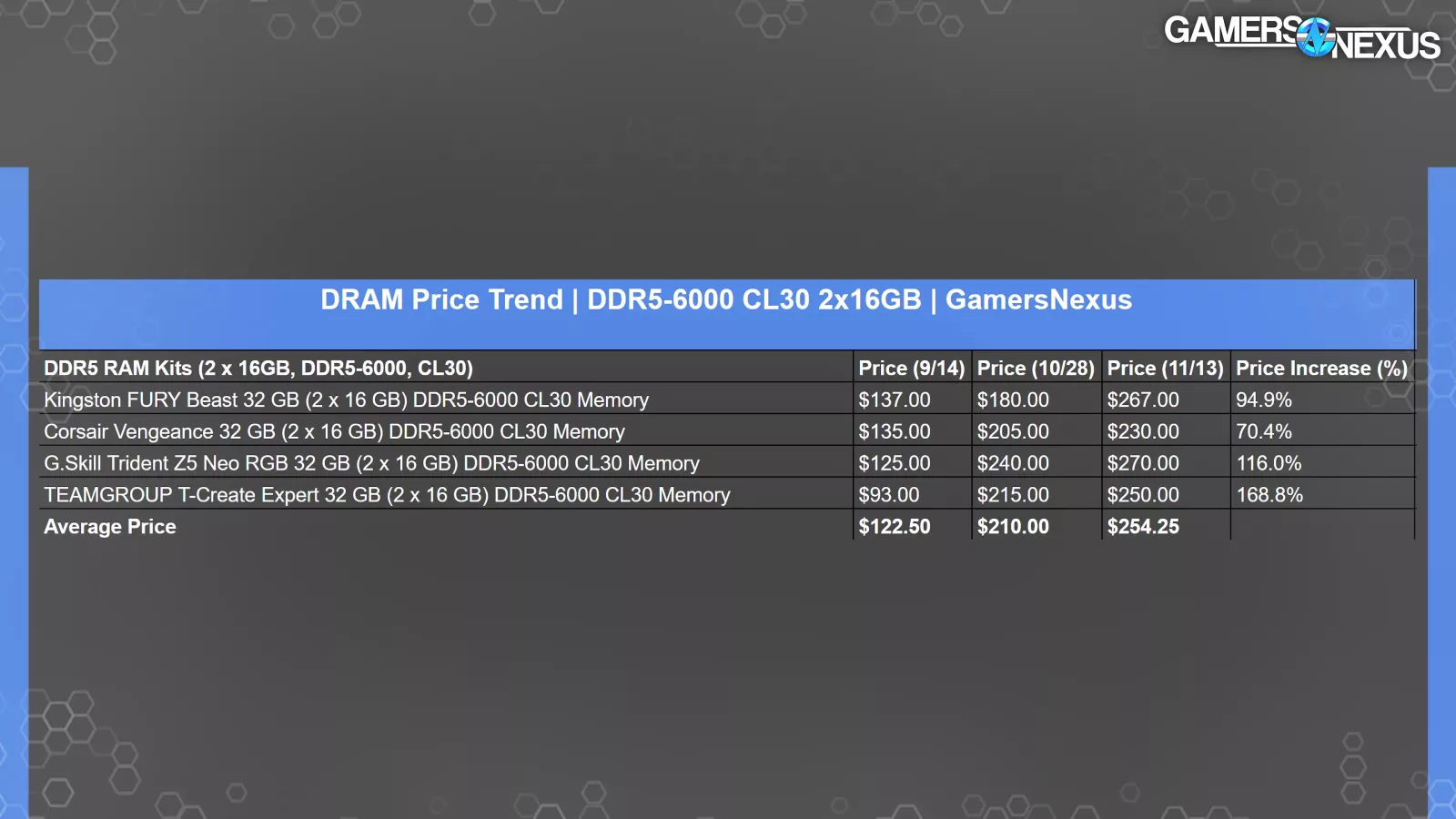 This table focuses on kits of 2 x 16GB DDR5-6000 CL30, with one kit each from four of the largest vendors. This table includes each listing’s Newegg price in mid-September, which is prior to the most apparent price increases, and then again in November.