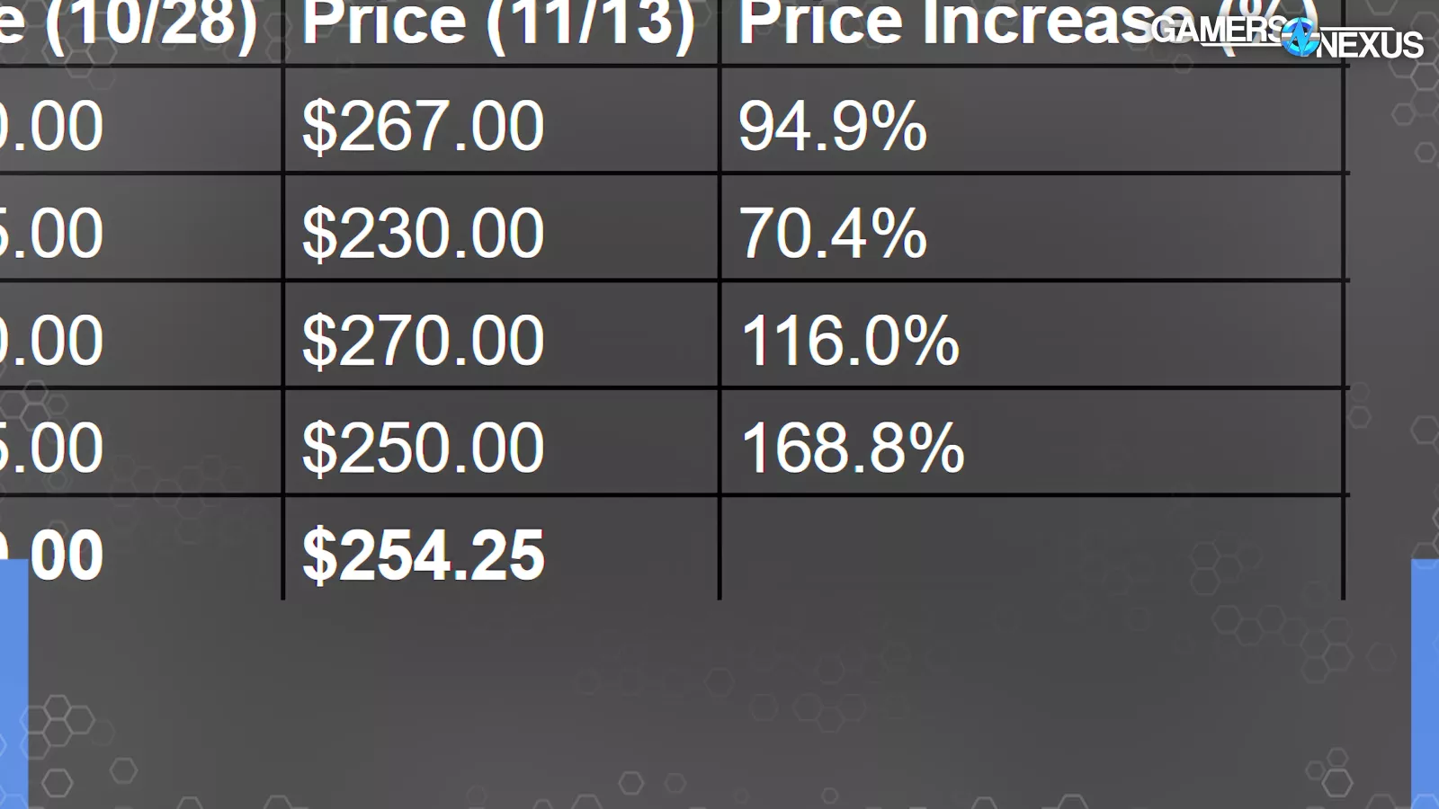 Broadly speaking, we’re seeing around a $130 price increase on this spec of kit since September. The average percent increase in price of comparable kits is in the range of around 100%, depending on if you expand the scope to other kits.
