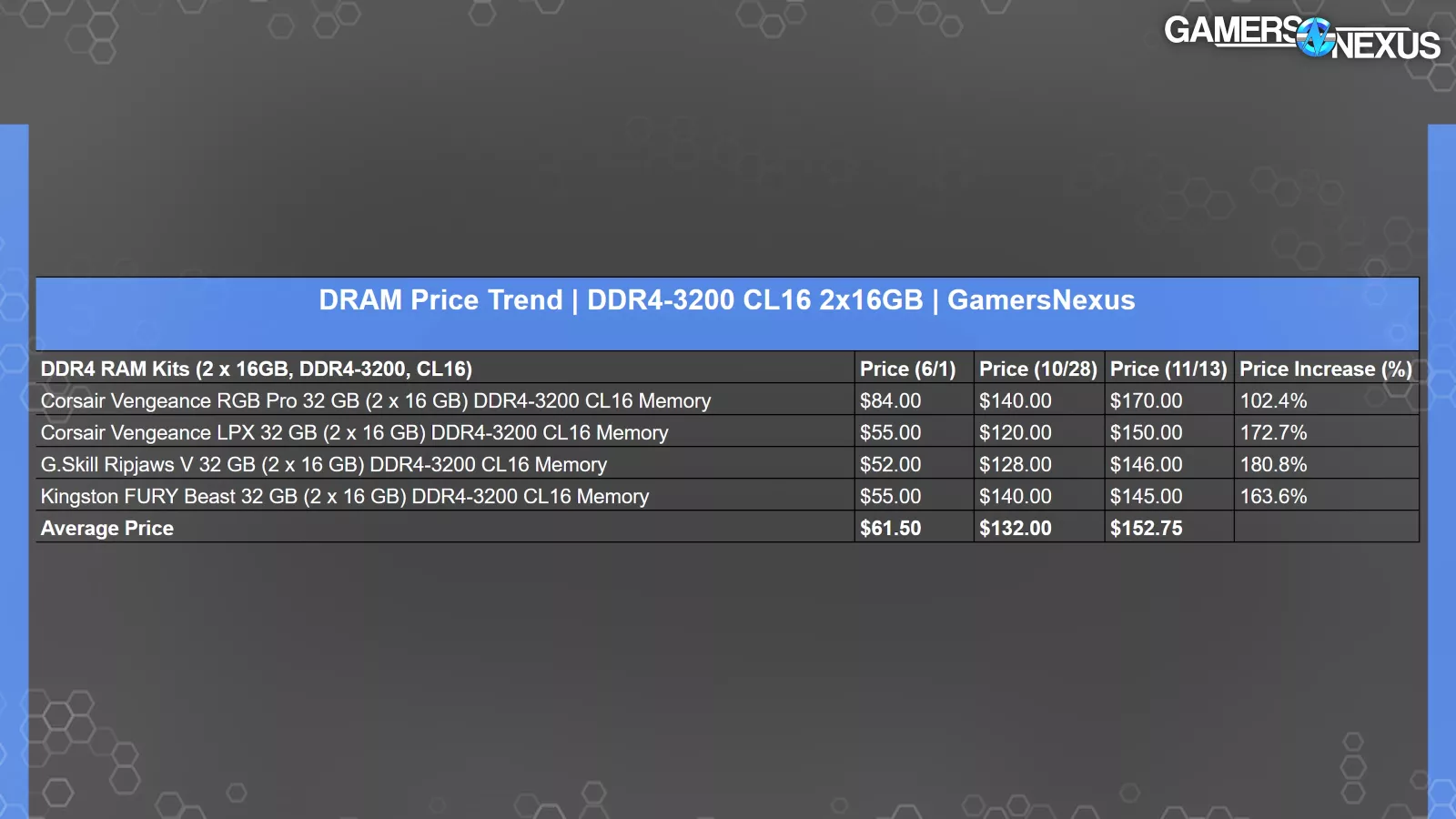 We’ll focus on kits of 2 x 16GB DDR4-3200 CL16 with an expanded date range of June 1st to November 13th. There was the most data for this spec. So that’s why we chose it.