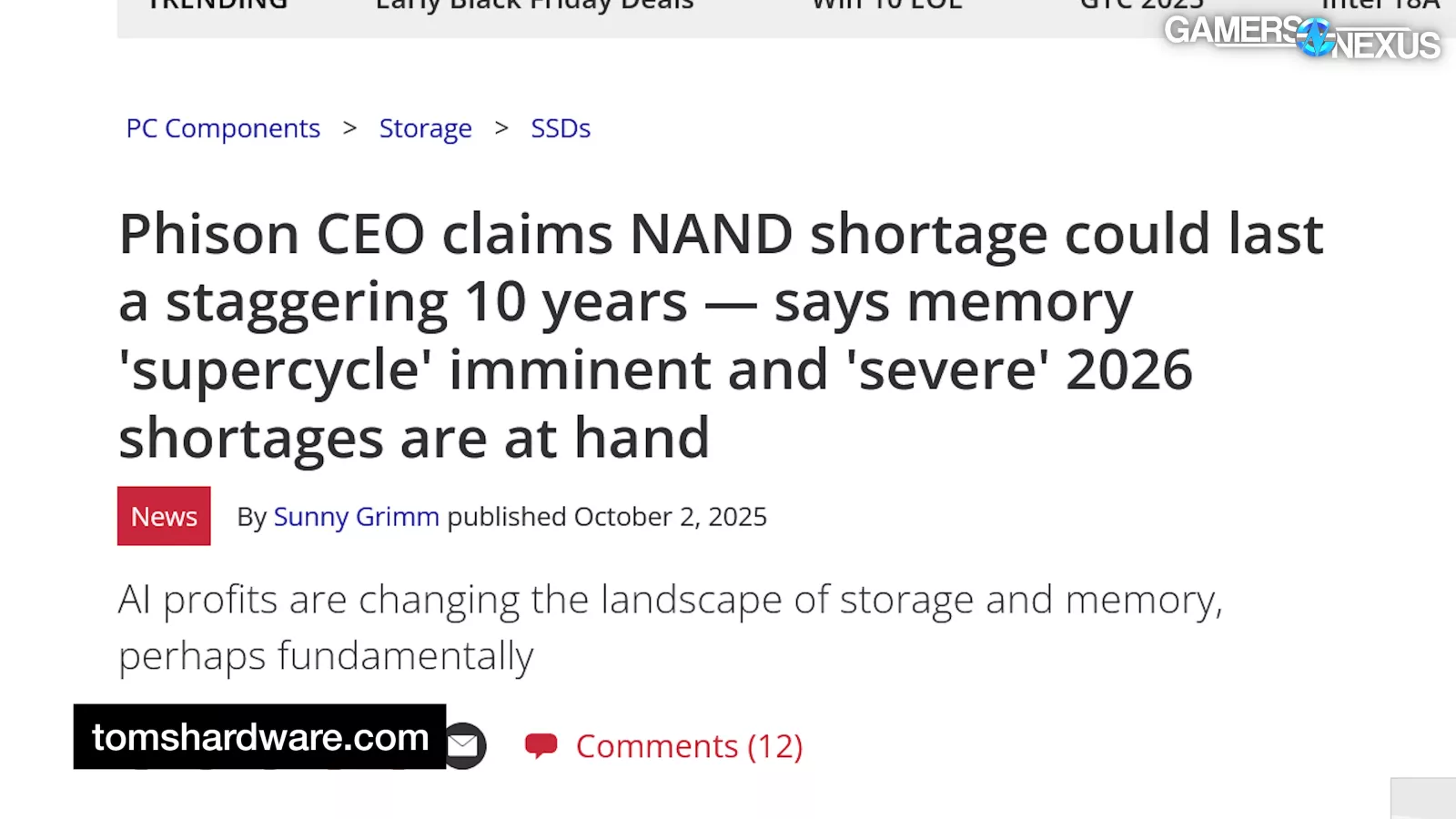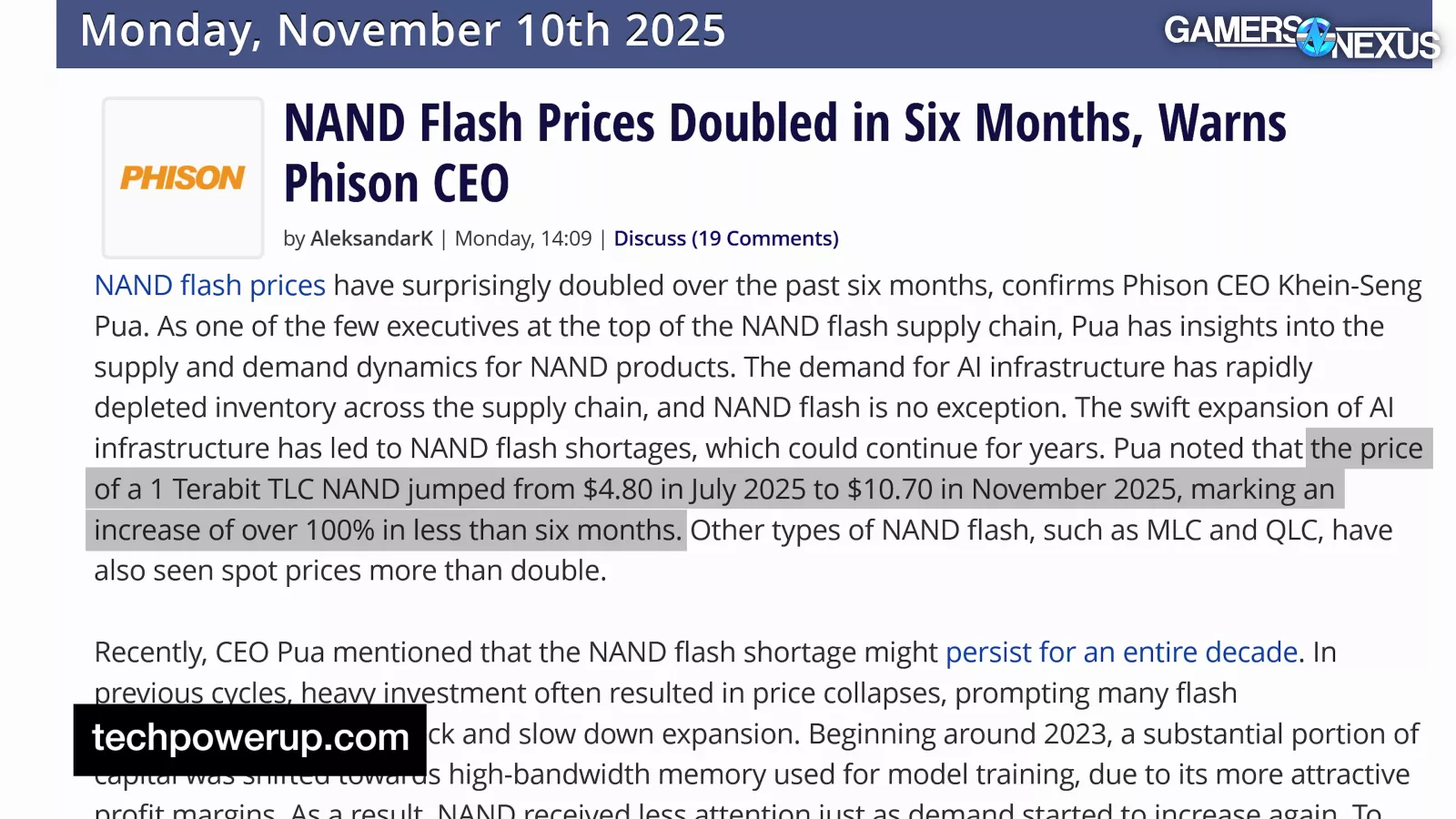 In October 2025, Phison CEO Pua Khein-Seng warned of severe NAND shortages to come in 2026, even claiming “I think supply will be tight for the next ten years,” citing a combination limited investment for the last few years as well as data center storage as the primary driving force.