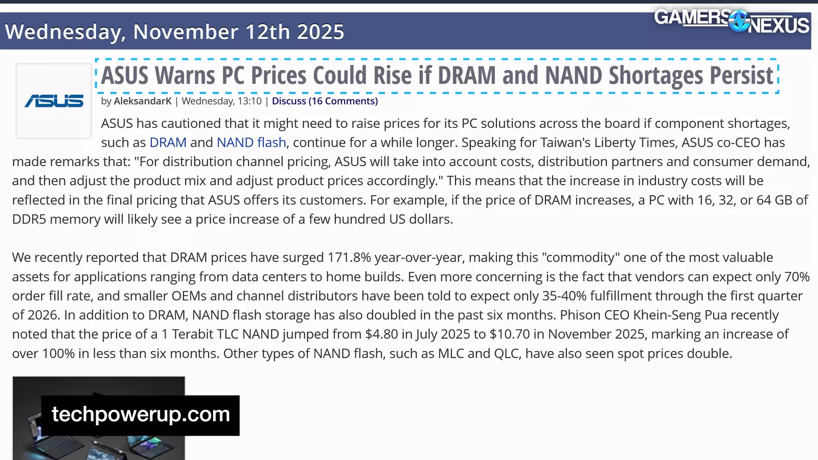 We explore why RAM prices have gone up, the impact to NAND, the impending impact to GPU VRAM prices, and how there's nothing any of us can do