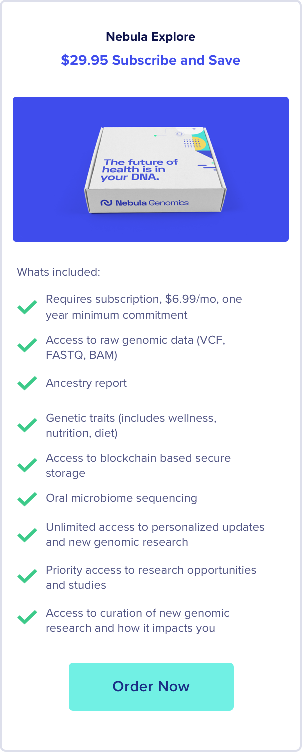 Nebula Explore gives people a way to have their whole genome sequenced while maintaining privacy and ownership of their data. You will receive a wide range of data that will provide insight into: