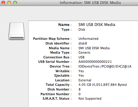 Now you need the OS X Disk Identifier. In my case it is "disk8" so the storage block device is /dev/disk8.