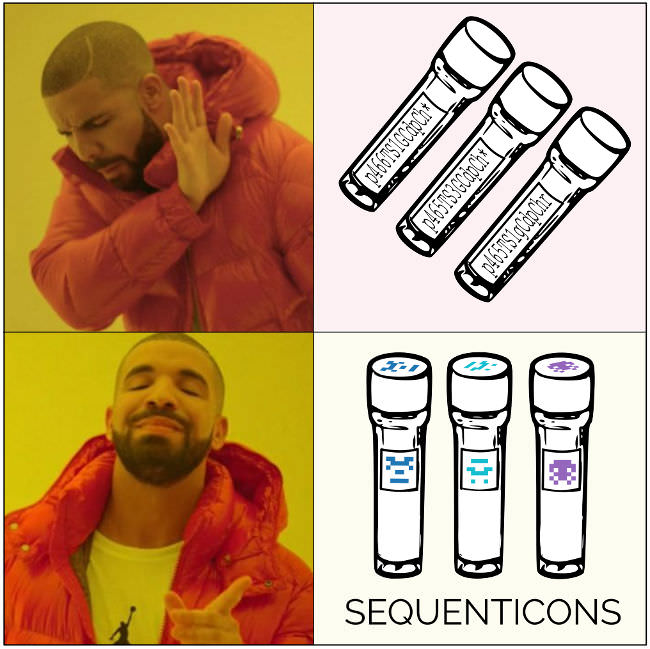 Sequenticons can also be used to ease the handling of biological samples by humans. With the right printer, you can label your tubes with colorful little sequenticons which will be much easier to identify than complex and often very similar text labels.