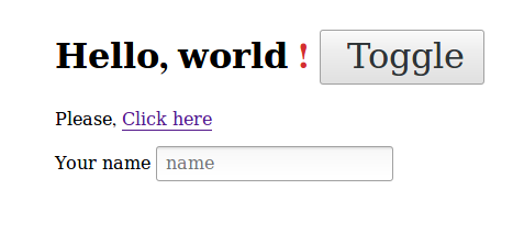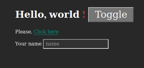 <style media="screen"> body { padding: 50px; } #btn { height: 50px; width: 150px; } .red-text { color: #d32f2f; } </style> <h1> Hello, world <span class="red-text">!</span> <button type="button" name="button" id="btn">Toggle</button> </h1> <p>Please, <a href="#">Click here</a></p> <div id="form-container"> <form> <label for="name">Your name</label> <input type="text" name="name" value="Hello world" placeholder="name" /> </form> </div>