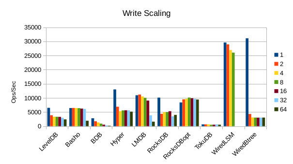 LMDB only allows a single write transaction at a time, which is the key to its serializability, whereas RocksDB supports multiple parallel writers. This fundamental difference had previously limited my thoughts on how Meilisearch could be optimized. However, we've realized that reading in parallel while writing is possible with LMDB. This is the most impactful discovery for enhancing the Meilisearch indexer! We can access the database content while using the write transaction by using a read transaction in each indexing thread — note that having more readers while writing clearly impacts write throughput. However, LMDB, with a single writer, remains impressively performant compared to RocksDB, with large values that we tend to have, i.e., large bitmaps. Additionally, LSM trees have higher write amplification, especially when writing in parallel, which we aim to minimize.