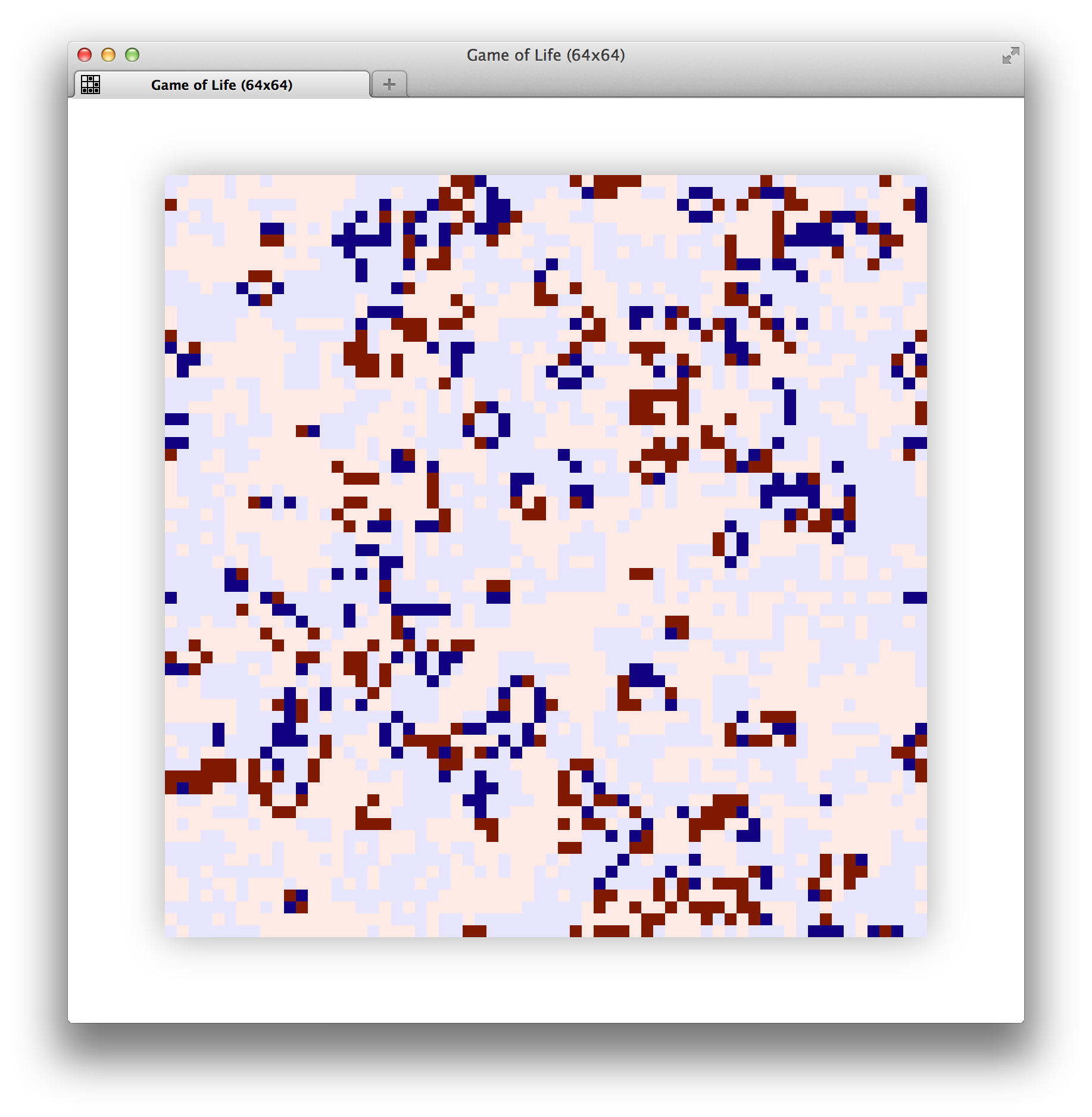 The page in the browser registers to receive updates from all clients, and updates in real time as soon as the workers start running. Alive cells are dark, dead cells are light. Their hue shifts slightly at each step to show how the grid updates.
