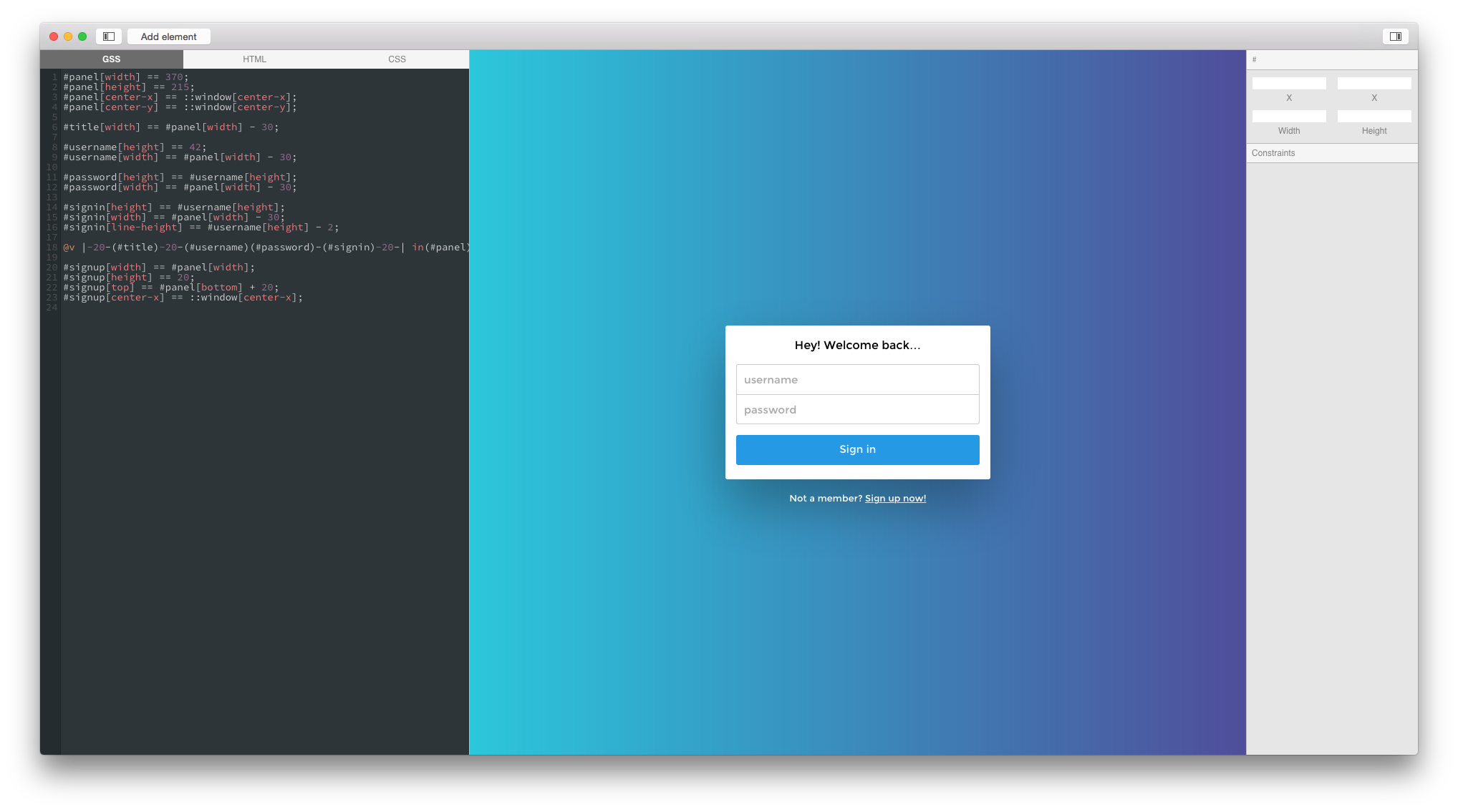 Bind is an open source, experimental tool for designing interfaces. It's a native OSX app that allows you to design using GSS, an auto-layout like language for describing an interface via constraints. Bind is not meant to replace tools like Sketch, Photoshop or Framer, but is instead suited for the niche task of laying out user interfaces. For more background info, see the blog post I wrote about it.