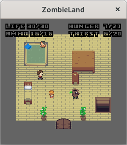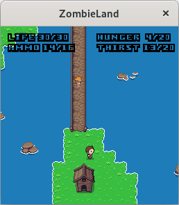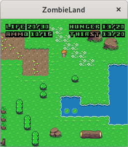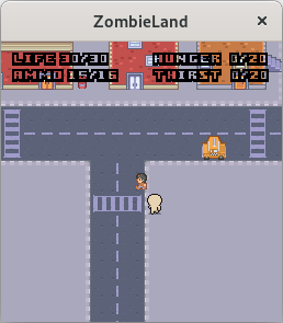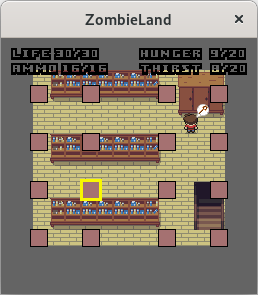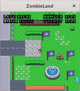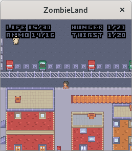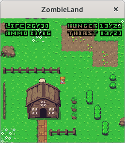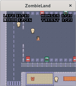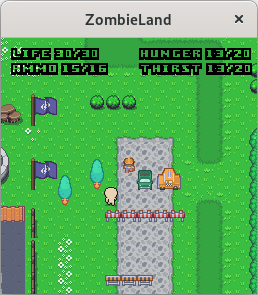 Start the server (zombielandd) on some computer, then start the client (zombieland) with two arguments: the address of the server and any username you like. Optionally, pass a third argument with a number between 0 and 6 to choose your appearance; see the file character.png to preview each look, numbered from 0 to 6 going down.