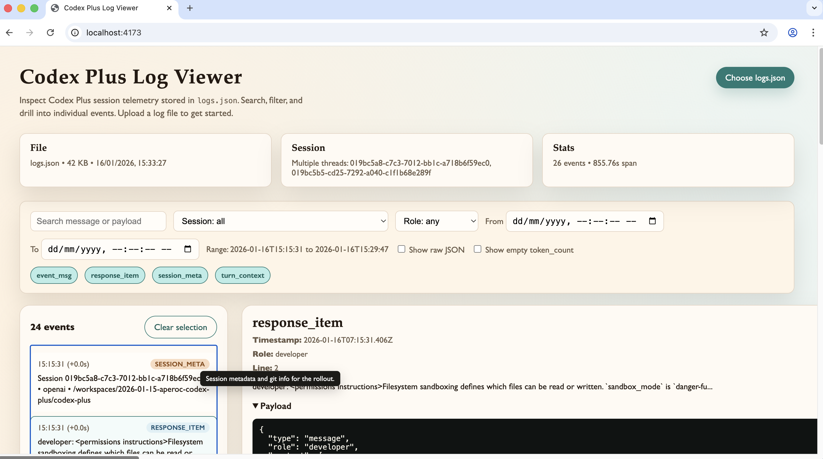 It exports the full session log to a remote OpenTelemetry collector after each run which can then be debugged and optimized through codex-plus-log-viewer.