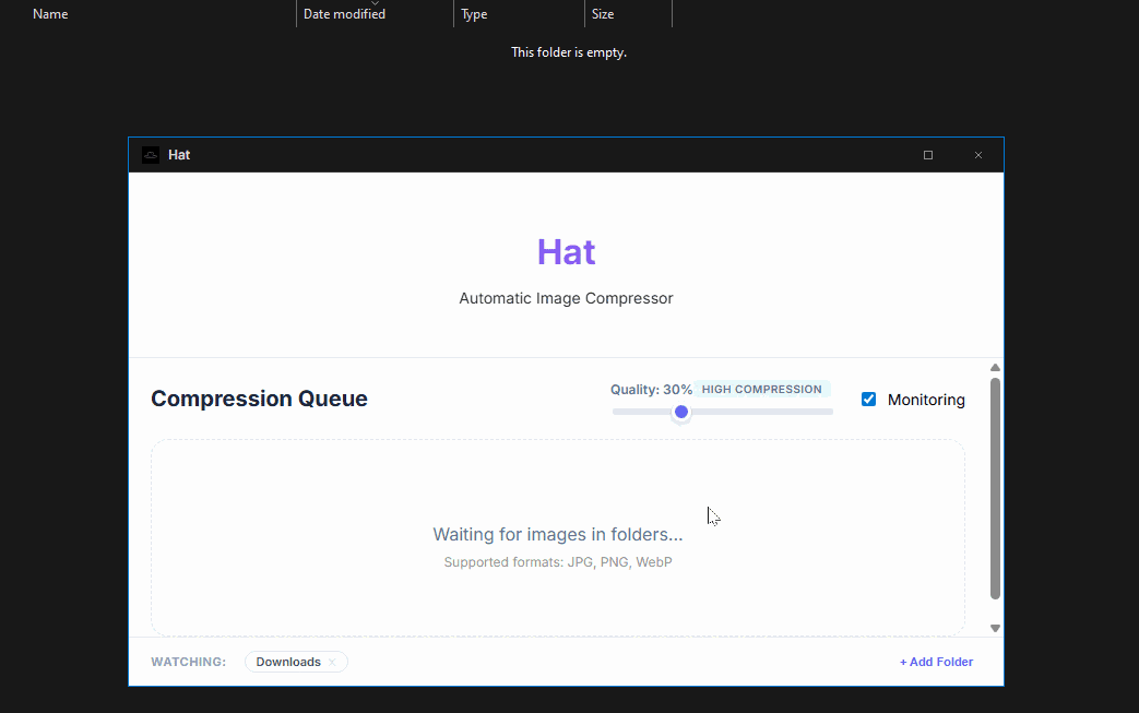 Hat runs in the background and watches a configurable list of folders for new images. By default, Hat only looks at your Downloads folder. When a new image arrives, it automatically compresses it and saves it with as with a (...)_compressed suffix in the same folder. Compression quality is configurable.