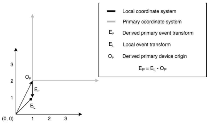 The calculation of EP, which is EL converted to be relative to the primary device’s origin. The server mutates the message sent by the secondary device who rendered the event at EL, effectively replacing EL with EP. This allows the primary device to take the incoming message and render it as is, without having to even consider where the coordinate originated from. It allows the primary device to treat all incoming messages as if they originated locally.
