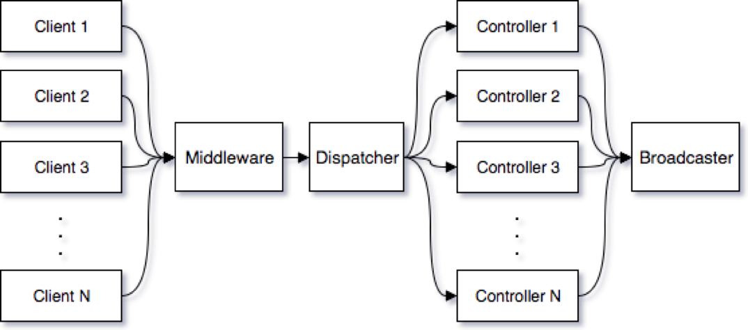 Controller methods receieve requests and broadcast responses to clients. Requests can be passed as-is, demonstrated with the CreateDefaultResponse method above, or information can be appended before responses are broadcasted.