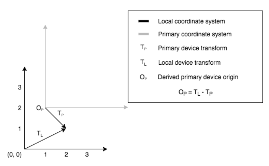 After receiving the immediate ping, a secondary device is considered to be authenticated and ready to interact with other devices in the session. The invention uses the TL and TP relationship between every secondary device and the primary device in order to calculate the primary device’s origin in the secondary device’s coordinate space. This equation, explained in the image below, acts as the bridge between a secondary device and any other authenticated device in the network, whether that be the primary device or another secondary device.