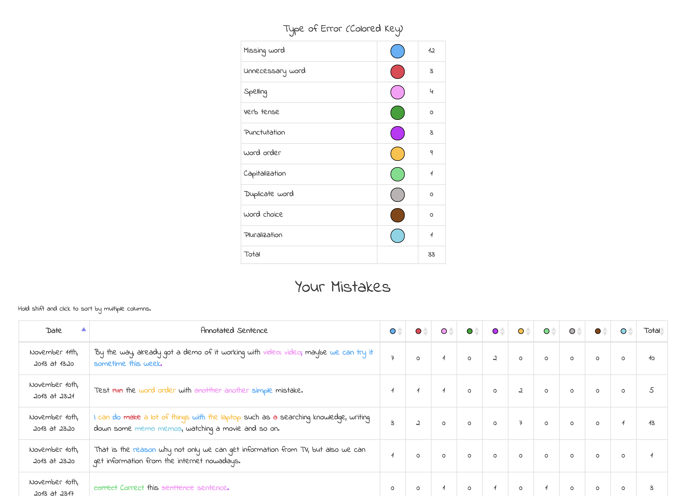 A Ruby gem to help students improve their English. A teacher can correct a student's sentence and this gem will automatically provide information on the type of error (i.e. punctuation, spelling, etc.), the placement of the errors, and the number of errors.